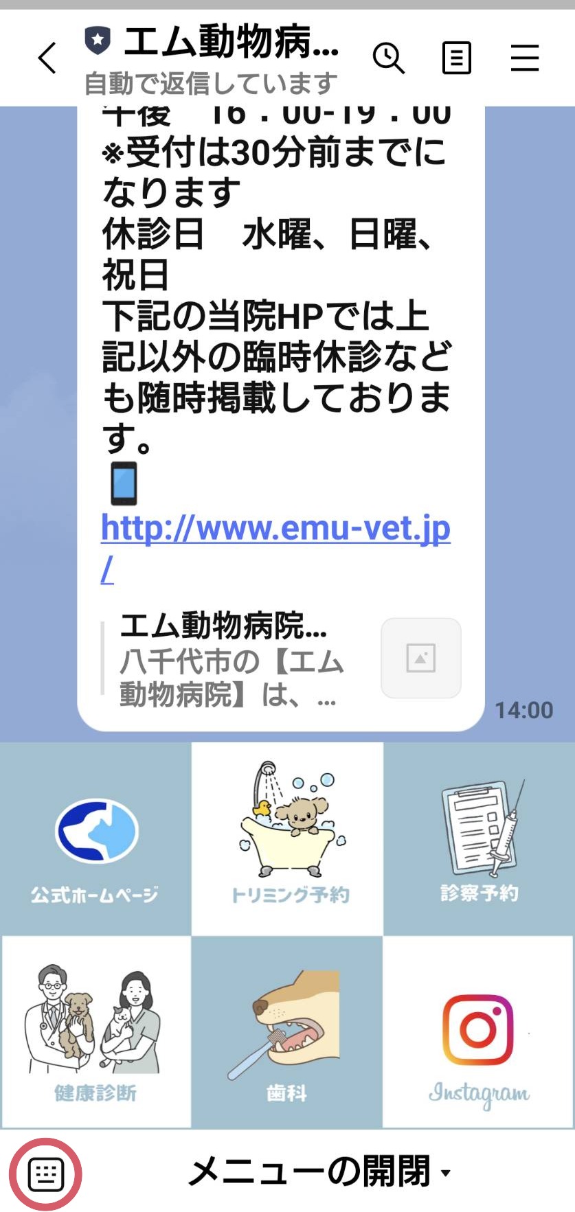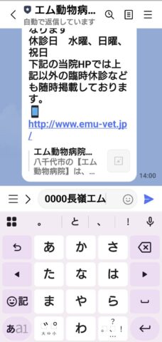 初診で診察券番号がない方は「初診」「飼い主様のお名前、ペットちゃんのお名前」をお送りください。