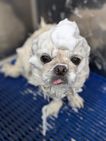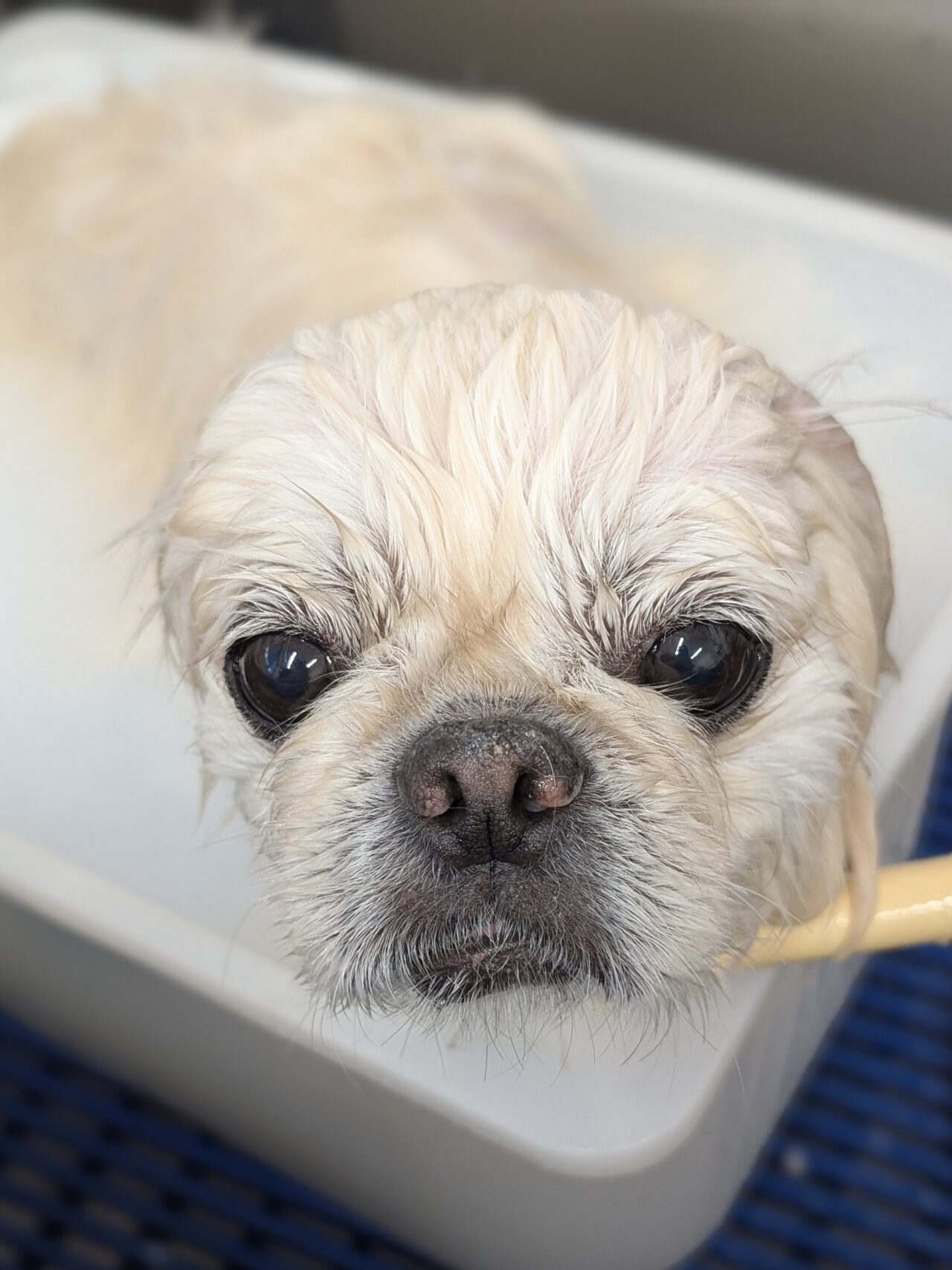 お薬シャンプー&カットコースのご利用です。ミックス犬の空くん。