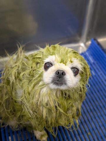 お薬シャンプーコースのご利用です。ポメラニアン×ミニチュアピンシャーのマーロンくん。