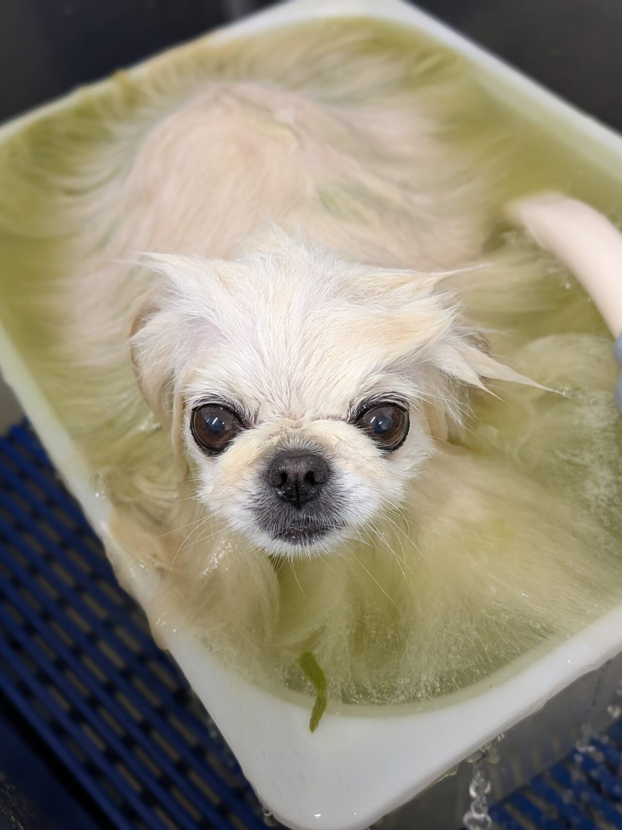 シャンプーコースのご利用です。ポメラニアン×ペキニーズのくうくん。