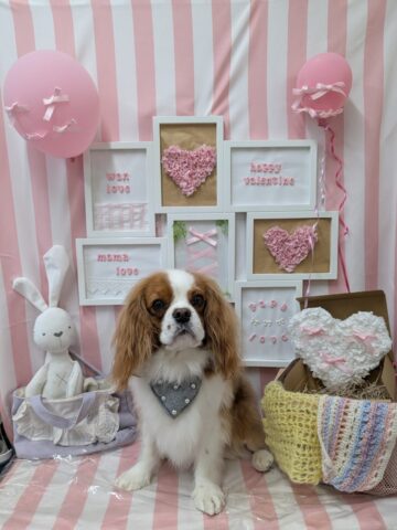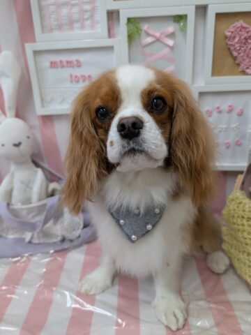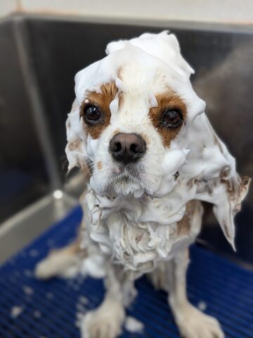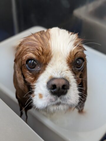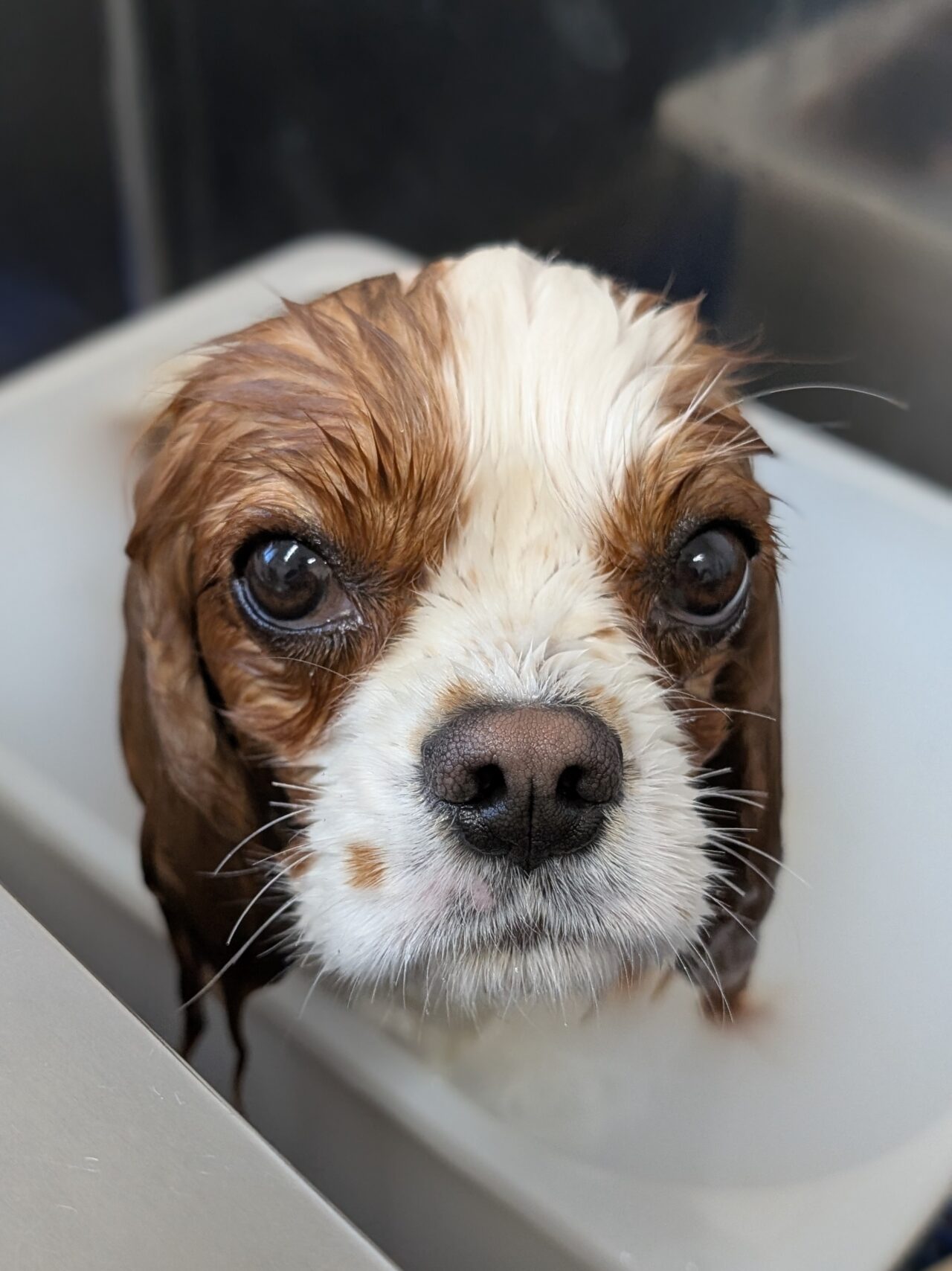 シャンプー&ポイントカットコースのご利用です。キャバリアのグリくん。