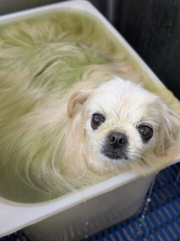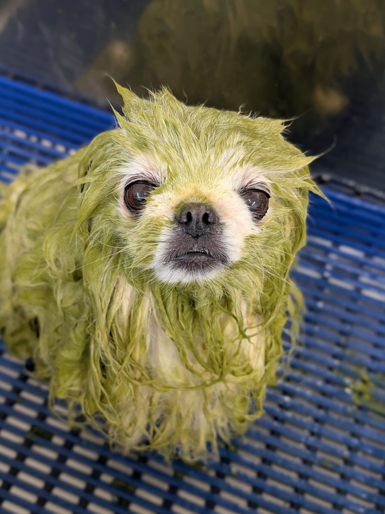 ハーブパックで緑に変身。静電気も抑えてくれる万能パック。健康な皮膚と美しい被毛とっても可愛いです🥰