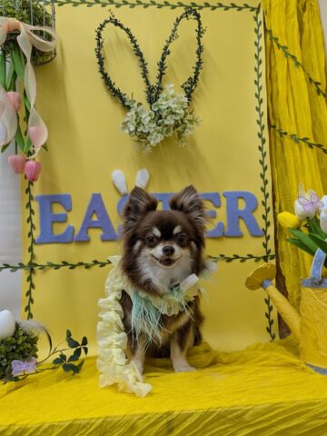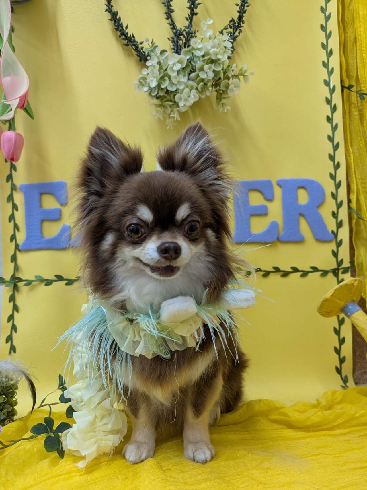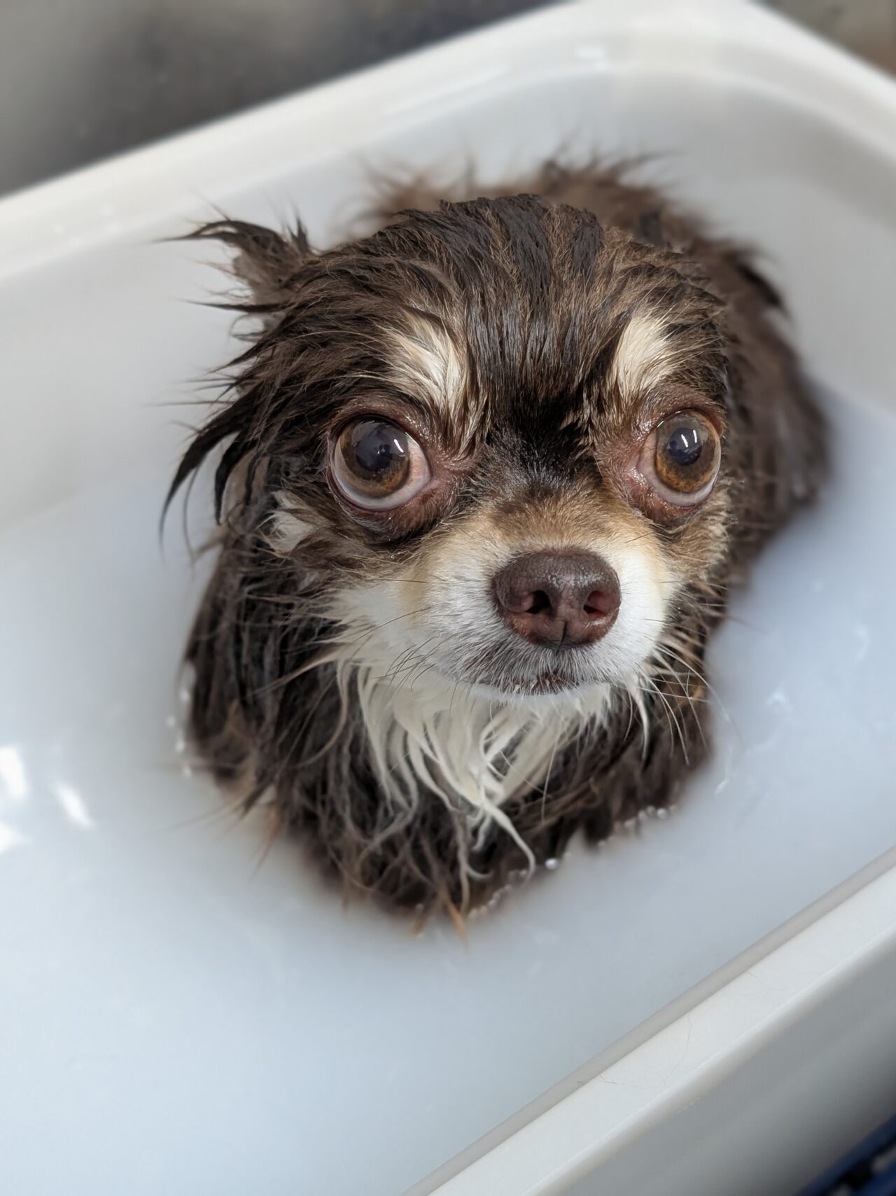 シャンプー&ポイントカットコースのご利用です。ロングコートチワワのロッキーくん。